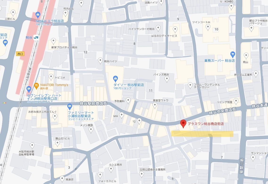 周辺地図 プラスワン桃谷商店街店 〒544-0033 大阪市生野区勝山北1-5-4-1F TEL.06-6716-1517 電車の場合 JR環状線 桃谷駅改札口を出て、桃谷商店街の通りを東へ徒歩約4分。 自動車の場合 勝山通り又は、桃谷商店街付近の駐車場を利用して下さい。 ※提携の駐車場はありません。